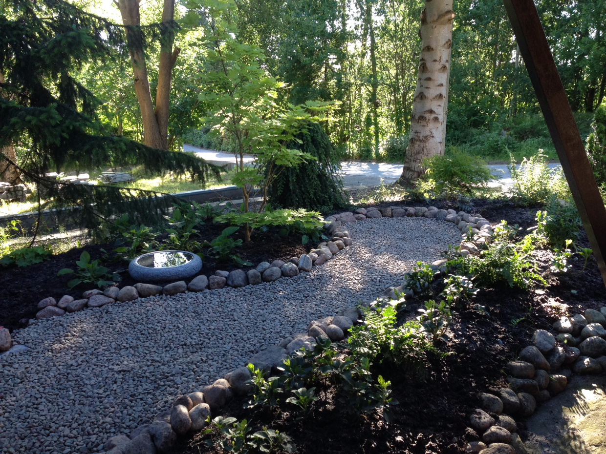 | Vackert silat ljus på kvällen. Fågelbadet på plats. Allra längst till vänster en daggkåpa som flyttades från hörnet vid bäcken. |
